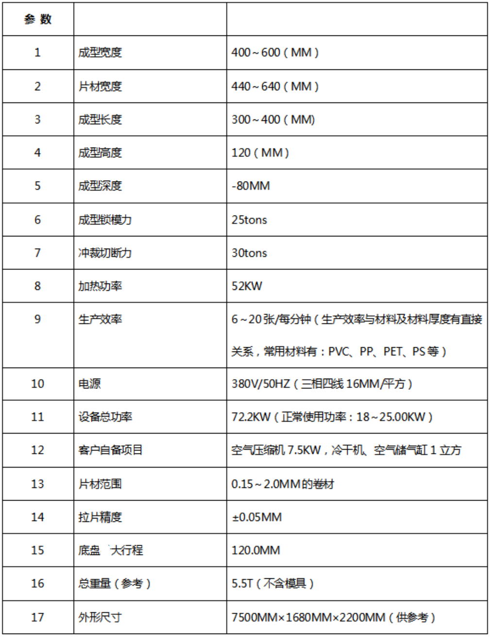 ZS-600/400塑料氣壓熱成型機(jī),是遵循客戶所需的高效,低成本,輕便使用塑料片材熱成型機(jī),是集機(jī)、電、氣一體化設(shè)計(jì),采用微電腦及可編程控制器(PLC)控制,人機(jī)界面操作,成型過(guò)程即送片、加熱、成型、切邊、堆垛。使用環(huán)節(jié)減少人工、操作便捷、提高生產(chǎn)效率、可靠性強(qiáng)、自動(dòng)化程度高,專用于熱成型和產(chǎn)品自動(dòng)沖切的流水式生產(chǎn)設(shè)備。