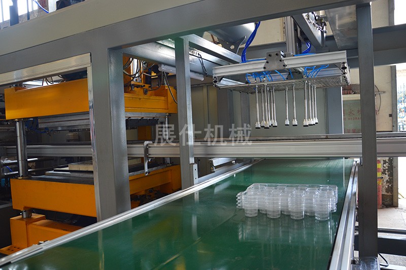 上料 →加熱 → 真空成型 →沖切 →分解堆疊→輸送帶輸送→廢料自卷系統(tǒng)